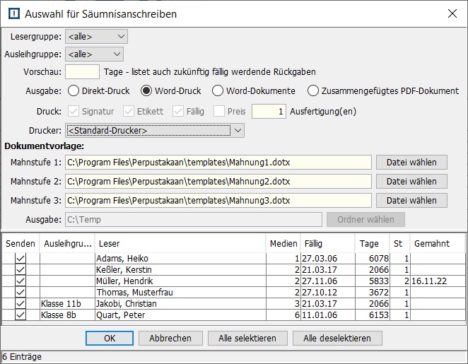 Leser, die Medien schon lange hätten zurückgeben sollen, und neue Medien ausleihen möchten, werden automatisch erkannt, die Ausleihe wird verhindert. Das älteste Soll-Rückgabedatum wird dabei angezeigt.