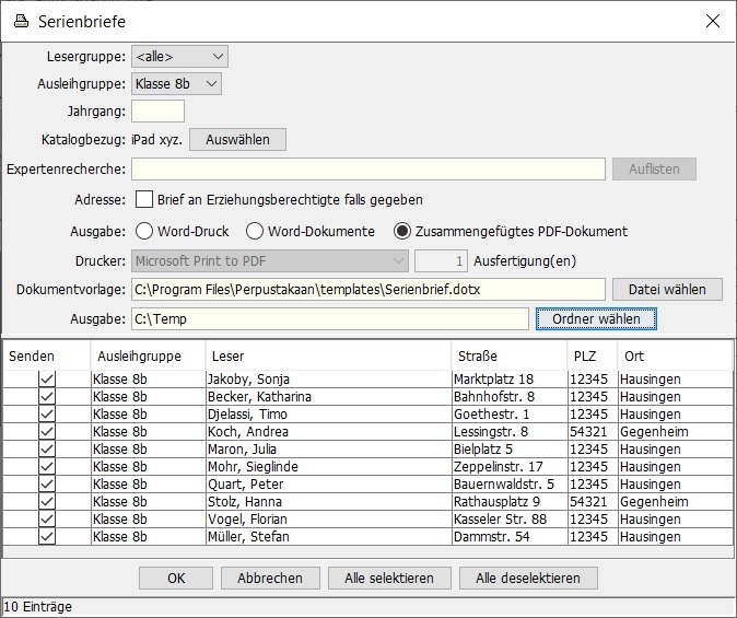 Auf Basis von Word-Dokumentvorlagen können jetzt mehrere Leser gleichzeitig angeschrieben werden. Auch die Erstellung von Word-Dokumenten zur Weiterverarbeitung sowie eines PDF mit allen Briefen in einem Dokument  wird unterstützt.