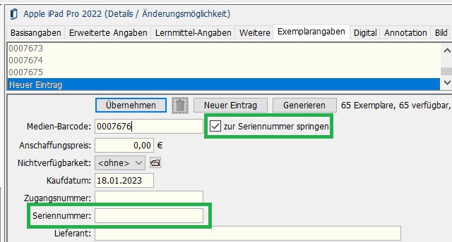 Bei den Exemplarangaben gibt es ein neues Feld, das für die Seriennummer bestimmt ist, z.B. für iPads. Die Eingabe ist optimiert: